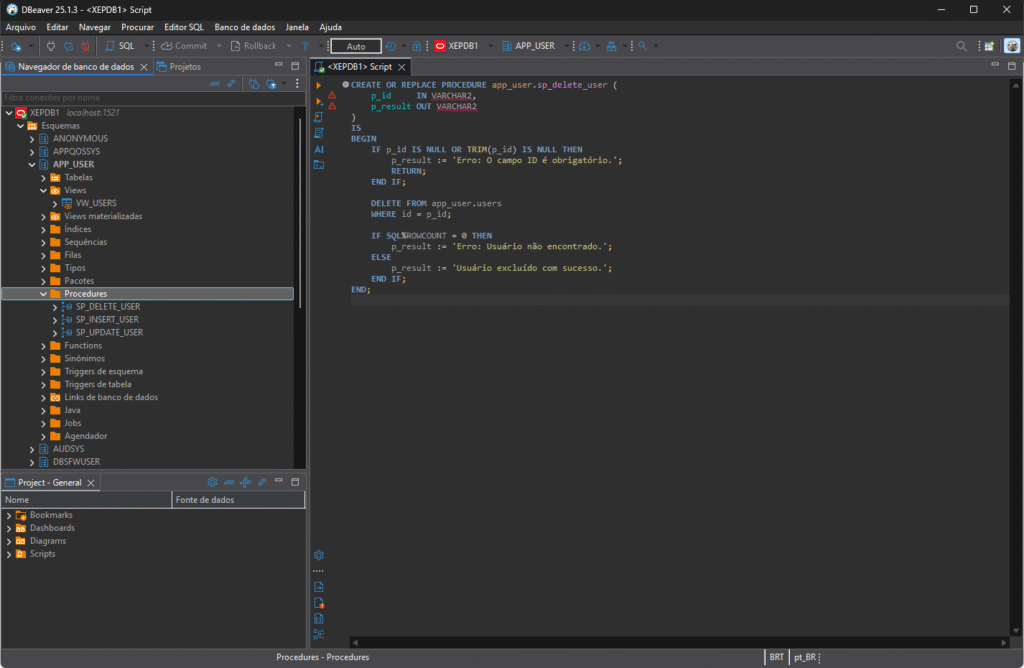 A stored procedure sp_insert_user demonstra como implementar a inserção de dados com validação diretamente no banco de dados, centralizando a regra de negócio no Oracle. Embora essa abordagem não seja comum em arquiteturas modernas voltadas à alta escalabilidade, ela ainda pode ser útil em sistemas internos, legados ou como exercício didático para ilustrar o uso do PL/SQL para controle de integridade e regras no lado do banco.